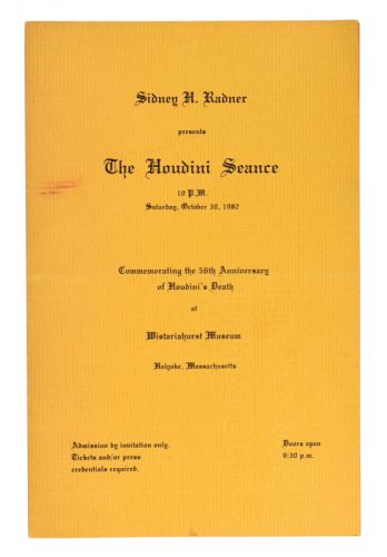 Sidney H. Radner presents The Houdini Seance. Commemorating the 56th Anniversary of Houdini's Death at Wistariahurst Museum in Holyoke, Massachusetts. Crease line and small soiling to covers, good condition.