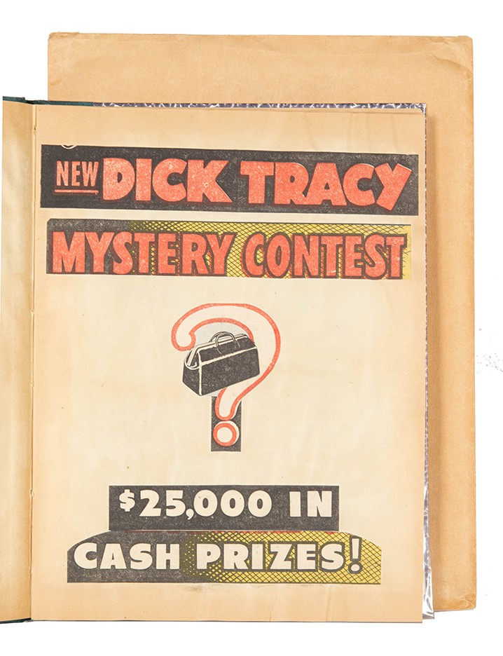 Complete run of clippings from the Chicago Daily Tribune for the mystery contest (Jan. 17-Feb. 26, 1949), which asked participants to answer “What Became of the Black Bag with One Million Dollars.” Neatly mounted in a cloth-backed binder by one Dan Howard, who at the conclusion types out his solution to the mystery. Laid inside are a number of related clippings, for example listing cash winners of the contest (a total of $25,000 was offered in prizes). In a paper envelope with ink design and copy of Chester Gould’s signature. Light rippling to some pages from scrapbook adhesive, otherwise good condition.