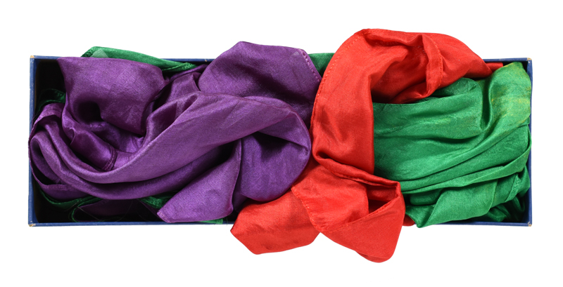 It's unclear due to lack of directions what effects exactly these silks are for - two are connected with a long thread at one corner, and the other two are connected with a weight at one corner. 22 inch silks. In original box which has a small hole, silks with some mild fraying a few stains. Good condition.