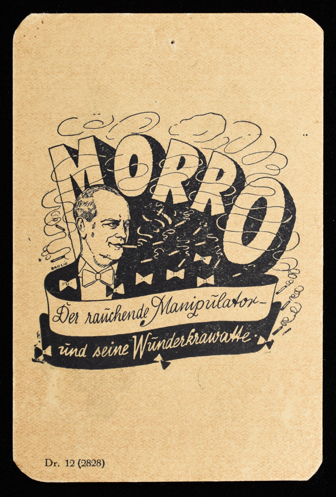 Thin stock card made for Morro with the Four of Clubs on reverse. "Der Rauchende Manipulator und seine Wunderkrawatte," advertising his cigarette and bowtie manipulation routines. Small pinhole on top edge, else very good.