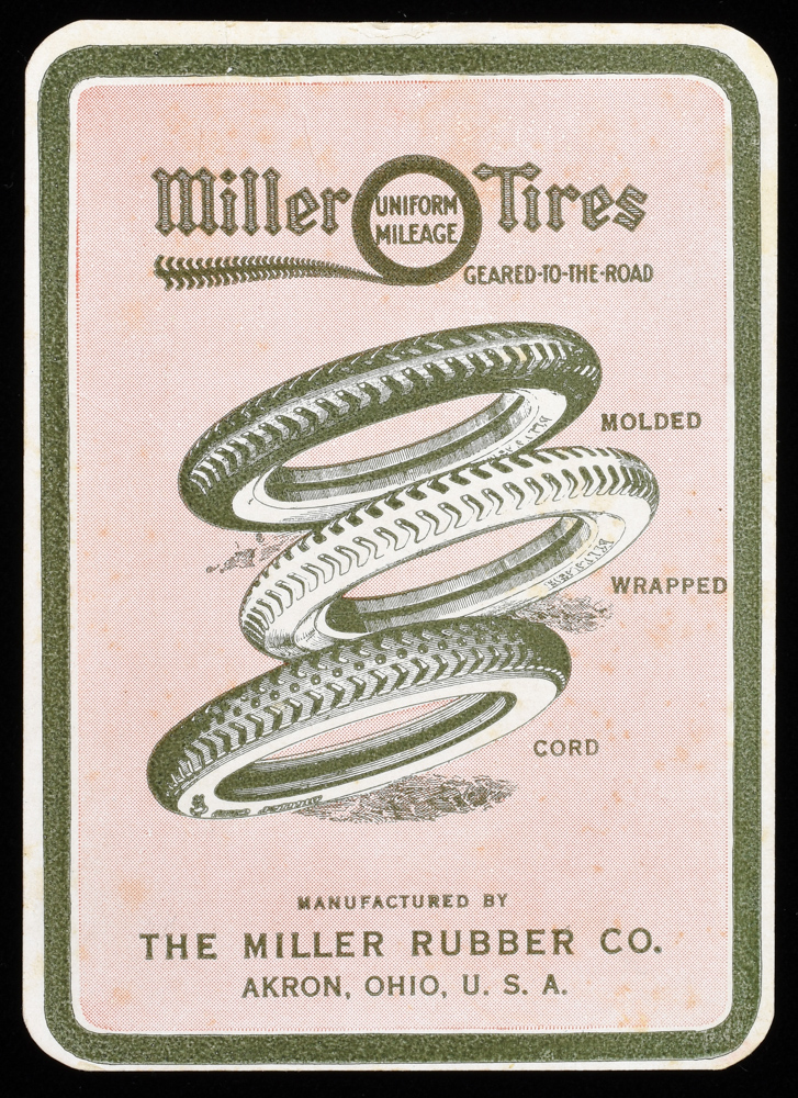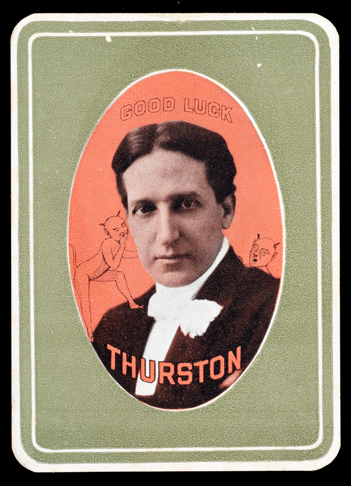 Crisply printed throw-out card for Howard Thurston, featuring his familiar bust and two imps on his shoulders. Reverse is an advert for Miller Tires. Mild crease to upper right corner, light wear to edges. Very good.